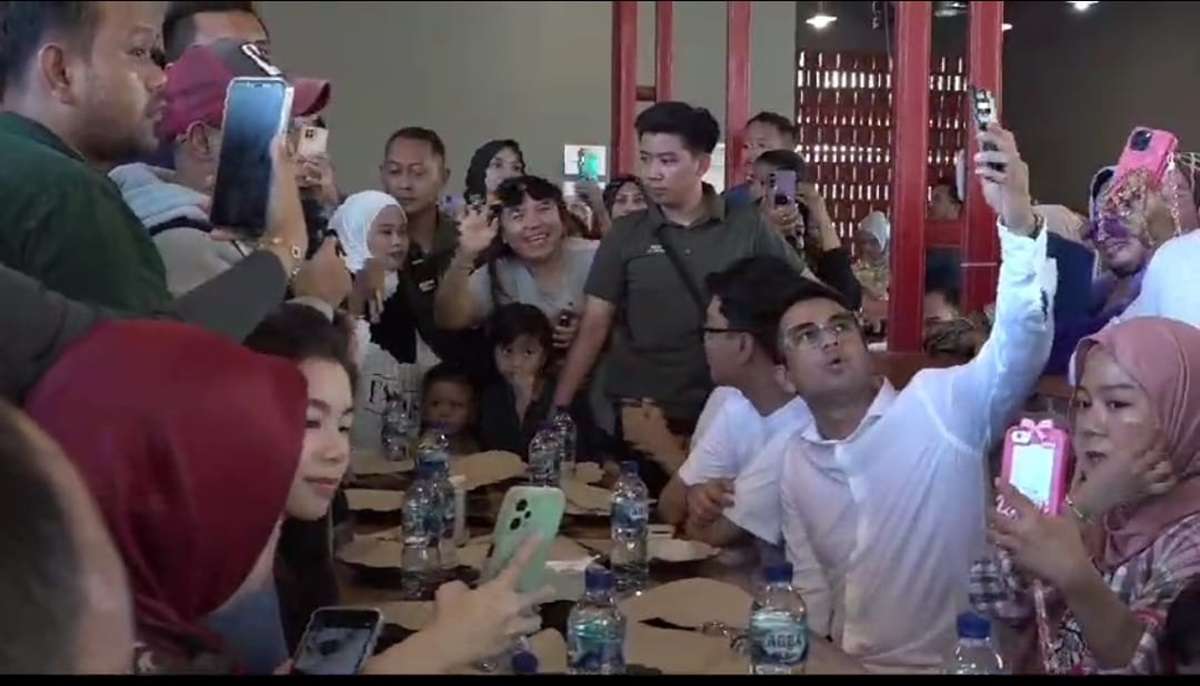 Para penggemar langsung menyerbu Raffi Ahmad saat keluar dari mobil menuju meja makan Rojo Sambel Palu.