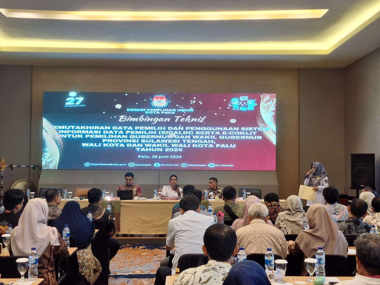 Madika, Palu – Komisi Pemilihan Umum (KPU) Kota Palu menggelar Bimbingan Teknis (Bimtek) mengenai Pemutakhiran Data Pemilih, penggunaan Sidalih (Sistem Informasi Data Pemilih), dan Elektronik Coklit (Pencocokan dan Penelitian) di salah satu hotel di Kota Palu, Kamis (20/6/2024).