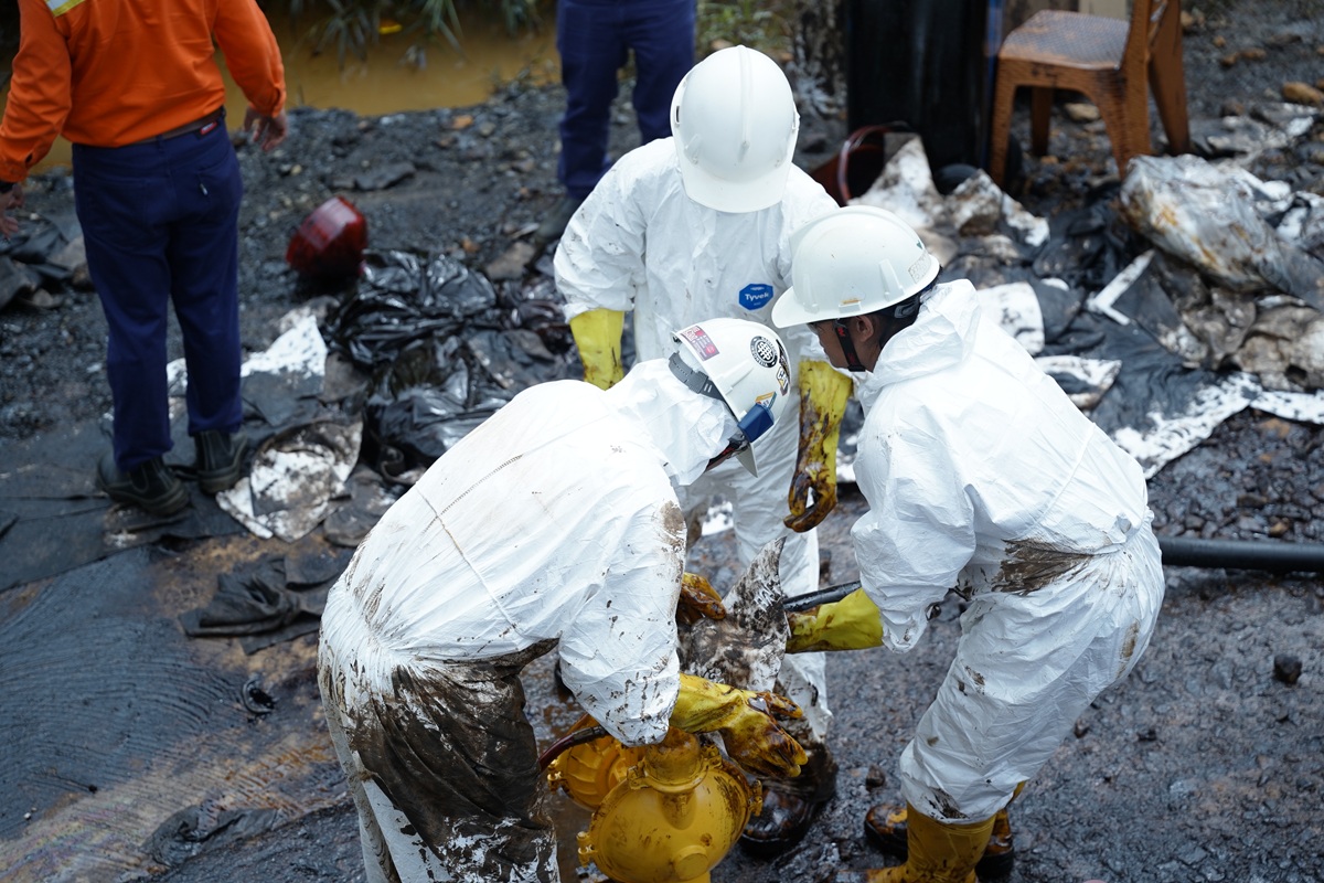Hingga Minggu (24/8), tim terpadu telah melakukan isolasi dan perbaikan pipa, pemasangan slick bar dan boom absorbent di titik kritis, pengurasan minyak (MFO) dengan tangki penampung, serta inventarisasi area terdampak.