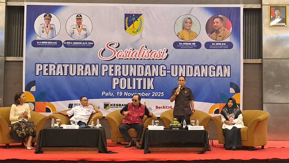 Madika, Palu – Anggota DPRD Provinsi Sulawesi Tengah, Mahfud Masuara, menjadi narasumber pada kegiatan Sosialisasi Peraturan Perundang-undangan Bidang Politik Provinsi Sulawesi Tengah dengan materi “Fungsi Aspirasi: Dari Aspirasi ke Regulasi dan Kebijakan”, Rabu (19/11/2025).