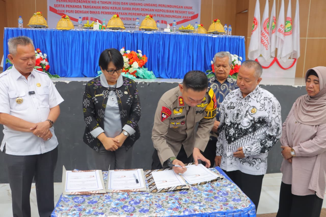 Madika, Sigi – Kapolres Sigi AKBP Kari Amsah Ritonga, menandatangani Nota Kesepahaman (MoU) kerja sama antara Polres Sigi, PGRI Kabupaten Sigi, dan Dinas Pemberdayaan Perempuan dan Perlindungan Anak (DP3A) Kabupaten Sigi, Sabtu (7/2/2026).
